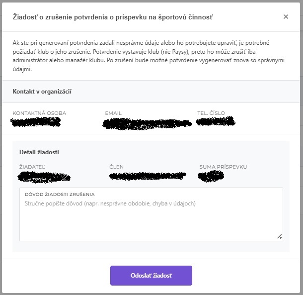 2. Následne Vám vyskočí okno, v ktorom vyplníte dôvod zrušenia a stlačíte odoslať žiadosť.