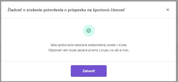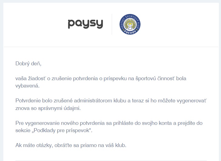 4. Po vybavení Vašej žiadosti , t.j. po zrušení potvrdenia zo strany klubu, Vám príde do e-mailu informácia o zrušení potvrdenia o príspevku na športovú činnosť dieťaťa. A následne si môžete vygenerovať nové potvrdenie so správnymi údajmi.